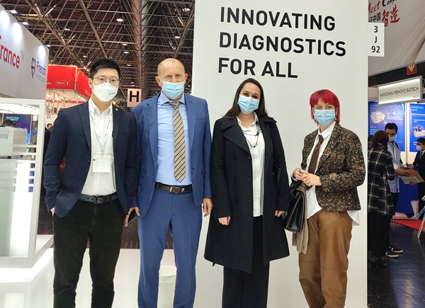 在经过同行推荐并使用了bb贝博艾弗森产品后,一位从事检测工作十多年的苏丹客户专门找到bb贝博艾弗森展台,进一步了解bb贝博艾弗森新冠和其他试剂检测业务。看完bb贝博艾弗森方案的操作后,他频频点头并表示,“你们的方案应用场景广、操作简便、精准可及,我非常看好你们!”